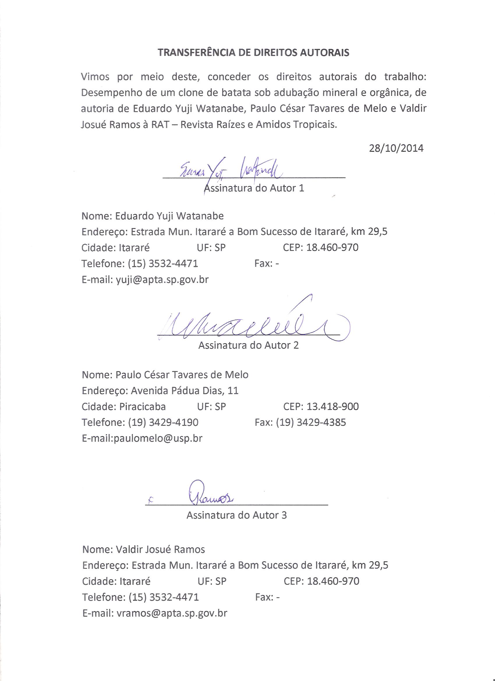 O objetivo do trabalho foi avaliar a produtividade comercial, o teor de matéria seca (%MS) e a ocorrência de defeitos fisiológicos mancha-chocolate e coração-oco dos tubérculos de batata do clone IAC 2.5 em três doses dos fertilizantes minerais 04-14-08 (N-P2O5-K2O) e sulfato de amônio, na presença e na ausência de composto orgânico de marca comercial Provaso. O tratamento com 3225 kg ha-1 de 04-14-08 + 5000 kg ha-1 de composto orgânico no plantio e 100 kg ha-1 de sulfato de amônio em cobertura foi o que apresentou a maior produtividade comercial de tubérculos.